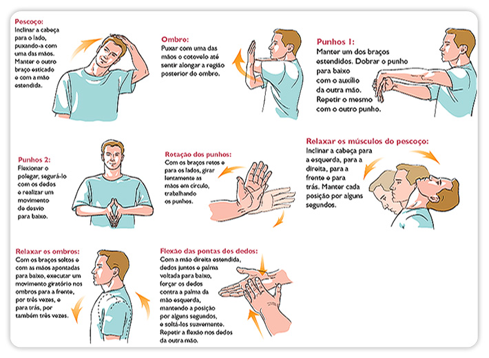 Estabeleça intervalos durante o expediente. Levante-se, ande um pouco e realize exercícios da figura abaixo durante as pausas. Inicie os exercícios de forma lenta e gradativa, alongue-se sem forçar e nem sentir dor. Permaneça na posição de alongamento por aproximadamente 20 segundos. Respire calmamente e regularmente durante o exercício.