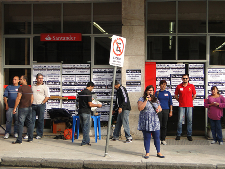 Bancários e a diretoria do Sindicato dos Bancários de Santos e Região paralisaram das 8h às 12h, dia 15, a agência do Santander, na Pça. Rui Barbosa, 31, em Santos/SP, contra a demissão de uma funcionária que estava em tratamento psicológico, por conta da cobrança por metas.