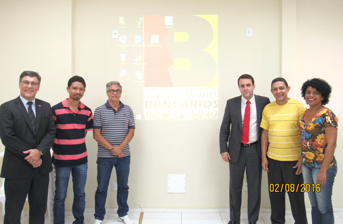 O Sindicato recebeu a visita de representantes do Banco do Brasil para informar sobre a implantação de dois escritórios de negócios (digitais) em São Luís, sendo um para atendimento a Pessoas Físicas (PF) e outro a jurídicas (PJ). O início de operação se dará em setembro e serão remanejados funcionários das agências.