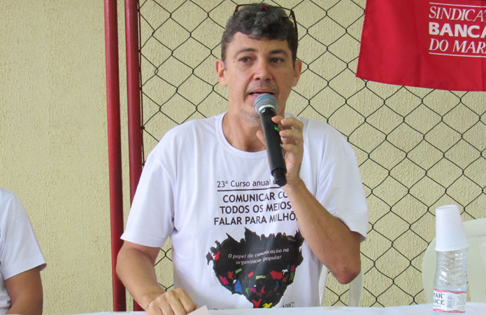 Durante o I Encontro Estadual dos Bancários 2018, realizado no sábado (27/01), na sede recreativa do SEEB-MA, no Turu, o jornalista e fundador do Jornal Vias de Fatos, Emílio Azevedo, fez uma breve análise sobre a conjuntura política atual e sobre a importância da mídia alternativa para a luta de classe.