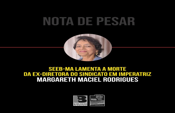 Neste momento de grande tristeza, todos os diretores e funcionários do SEEB-MA prestam seus mais sinceros sentimentos aos amigos e familiares de Margareth Maciel, desejando força e conforto no enfrentamento dessa irreparável perda. A todos vocês, nossa solidariedade!