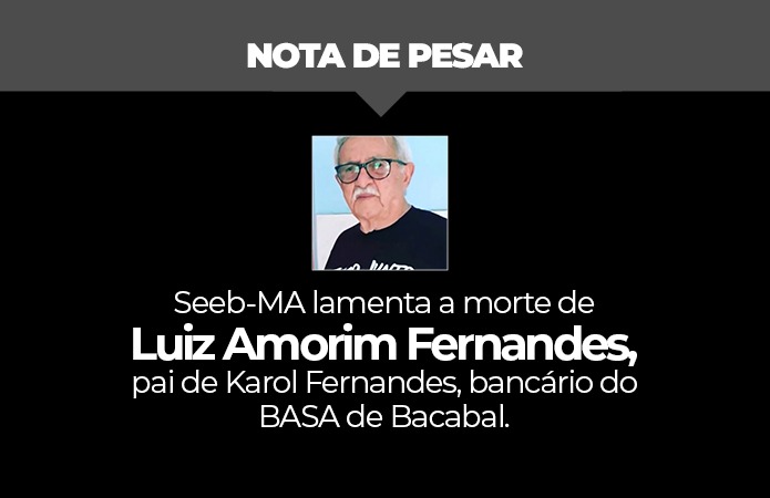É com tristeza que o Sindicato dos Bancários do Maranhão (SEEB-MA) comunica o falecimento do Sr. Luiz Amorim Fernandes, pai do bancário do BASA, Karol Fernandes. Seu Luiz foi encontrado morto no domingo (27/02), em Bacabal, após ser sequestrado por criminosos. A polícia investiga o caso. Neste momento de dor, todos os diretores e funcionários do SEEB-MA prestam suas condolências aos familiares de Seu Luiz Amorim.
