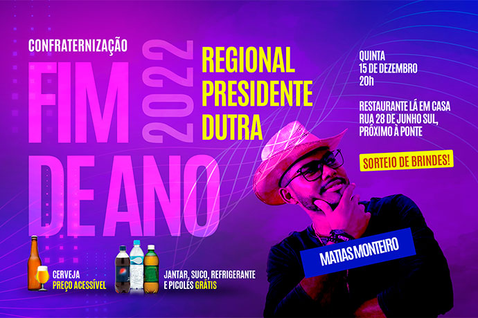 O SEEB-MA convida os bancários e seus dependentes para a Confraternização de Fim de Ano da Regional Presidente Dutra, que será realizada na quinta-feira (15/12), a partir das 20h, no Restaurante Lá em Casa, na Rua 28 de Junho Sul, próximo à ponte, em Presidente Dutra.