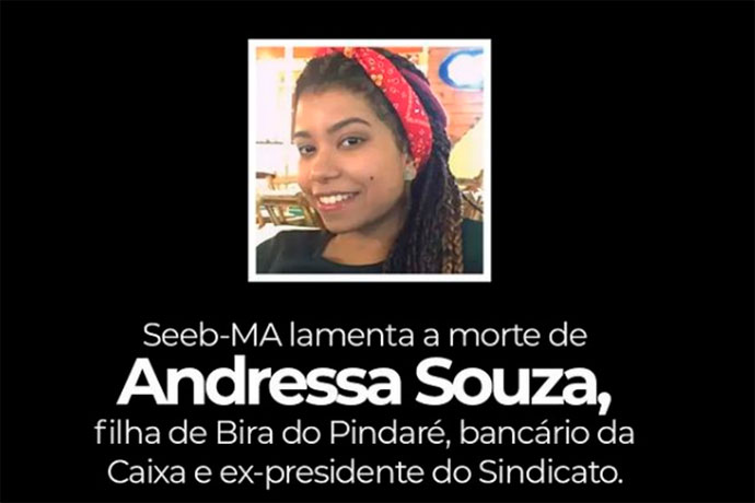 Neste momento de dor e de luto, todos os diretores e funcionários do SEEB-MA, assim como os bancários maranhenses prestam condolências e solidariedade ao companheiro Bira do Pindaré, aos demais familiares e aos amigos de Andressa, desejando força, fé e conforto a todos.