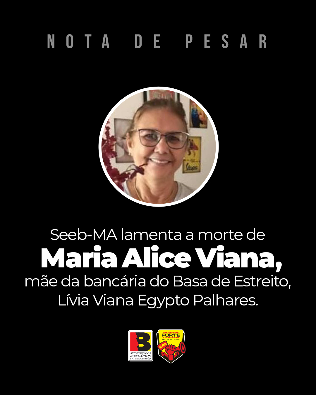 Em nome da categoria, o SEEB-MA se solidariza com Lívia Palhares, seus familiares e amigos, desejando força e serenidade neste momento de dor. Esperamos que as lembranças de Maria Alice permaneçam como consolo e inspiração entre todos e todas que a amaram.