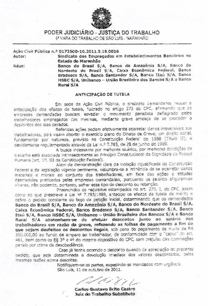 Justiça do Trabalho concedeu liminar que impede o corte de ponto dos bancários que aderiram à greve da categoria em todo o Maranhão.