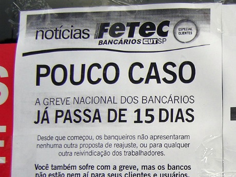 Hoje, a pelegada conhecida como "Bancários da CUT" amanheceu afixando nos bancos de Bauru cartazes que atribuem somente aos banqueiros a culpa pela greve. Mas, malandramente, se "esqueceram" de dizer que a culpa é também do governo Dilma.