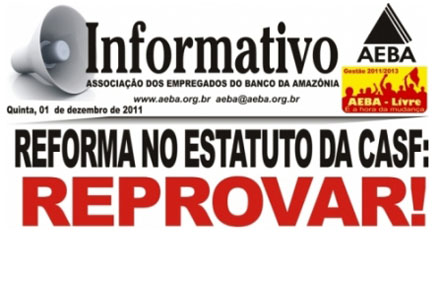 Nesta quinta-feira (15), os associados da Caixa de Assistência dos Funcionários do Banco da Amazônia (CASF) deverão se posicionar sobre a proposta de reforma no estatuto da entidade. Após uma análise do tema, a diretoria do Sindicato dos Bancários do Maranhão e a AEBA indicam a reprovação da reforma.