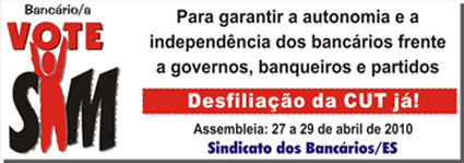 A Diretoria Executiva do Sindicato definiu, em reunião na última sexta-feira, 9, a utilização de dezoito urnas para a coleta de votos na assembleia que vai avaliar a proposta de desfiliação do Sindicato da CUT. A assembleia será realizada de 27 a 29 de abril, por escrutínio secreto nos locais de trabalho, conforme previsão estatutária. Das dezoito urnas, apenas uma será fixa: ficará na sede do Sindicato. A Executiva também aprovou a realização de uma campanha de mídia para divulgar a posição da entidade favorável à desfiliação, conforme aprovado pelo Sistema Diretivo do Sindicato no dia 6 de março, por ampla maioria. Posição minoritária O grupo minoritário formado por diretores do Sindicato que defendem a permanência da filiação à CUT abriu mão de utilizar o Correio Bancário para defender sua posição. Apesar de a decisão oficial do Sindicato ser pela desfiliação, a Executiva da entidade havia autorizado a publicação de uma edição especial do jornal para a posição minoritária defender seus argumentos, assegurando, assim, o amplo debate na categoria.