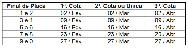 O IPVA 2012 pode ser pago em cota única ou parcelado em três vezes. Para quem optar por cota única, o pagamento está previsto para o mês de março, já para os contribuintes que decidirem parcelar, o prazo da primeira parcela é 2 de fevereiro para os proprietários de veículos com final de placa 1 e 2. Como todos os anos, o pagamento é realizado de forma escalonada, com base no final da placa dos veículos. Veja a tabela: