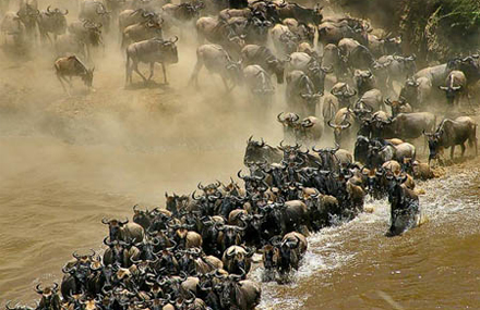 Inicialmente, hesitam em fazer a travessia, mas como se trata de sobrevivência, logo um gnu mais afoito se lança e é seguido pelos demais. Na aventura pela vida, inúmeros deles morrem atolados na margem dos rios ou são engolidos pelos crocodilos.