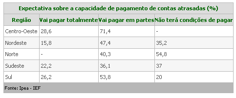 Por lá, 28,6% das famílias acreditam que vão conseguir pagar todas as suas contas em atraso e nenhuma delas mencionou que não teria condições de quitar suas dívidas. No Sul a taxa é a segunda maior do Brasil, de 26,2%: