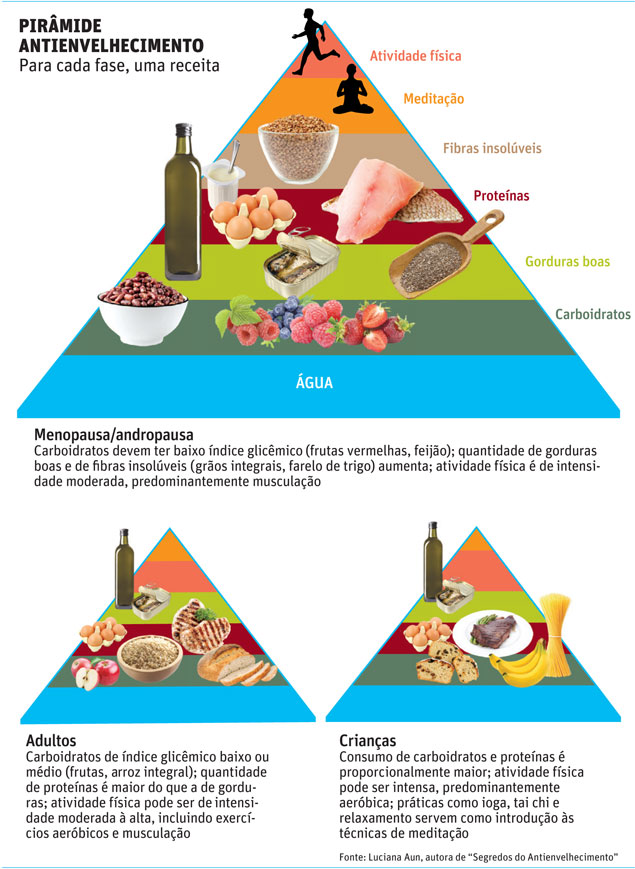 E lembrar que, para envelhecer bem, o corpo não quer só comida. "Não adianta comer tudo certinho se você vive estressado ou deprimido", diz Aun, que também colocou a atividade física e a meditação em sua pirâmide.
