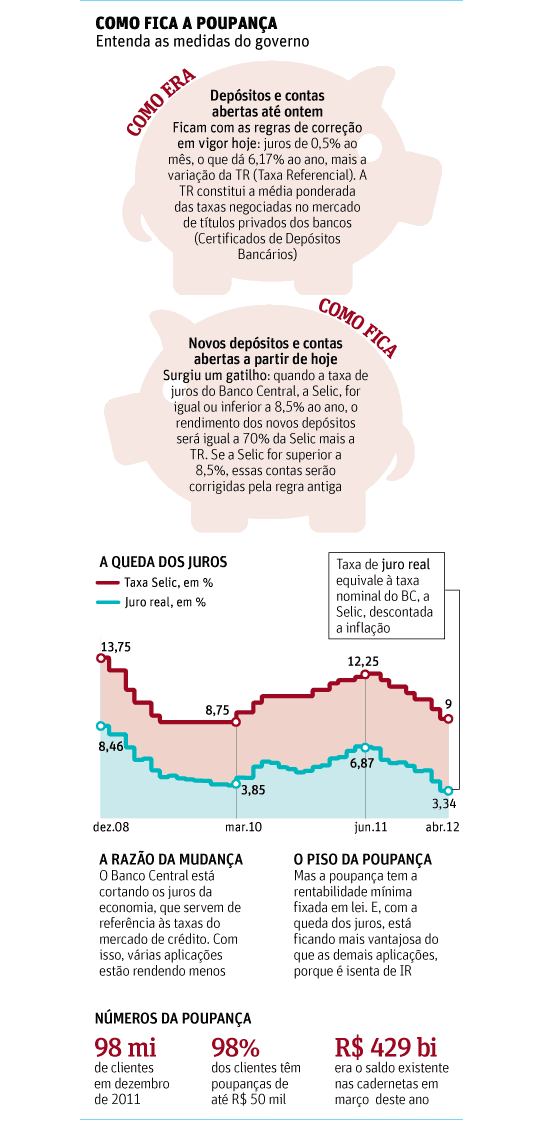 As regras da poupança, tradicional aplicação financeira do país, mudam a partir de hoje. O modelo vale apenas para novos depósitos e novas contas --as que já existem seguem com o cálculo de seus rendimentos sem modificações.