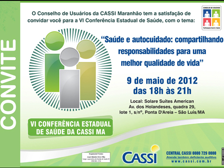 A VI Conferência de Saúde da Cassi será realizada nesta quarta-feira (09/05), às 18h, no American Flat, localizado na Ponta D’Areia, em São Luís. Durante o evento, haverá pronuciamento de representante da diretoria da Cassi. Na mesma ocasião, ocorrerá a posse dos integrantes do Conselho de Usuários da Cassi Maranhão para o biênio 2012/2014. Confira abaixo a programação e participe.