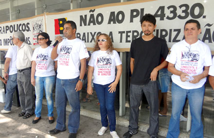 O SEEB-MA participou nesta terça-feira (06/08) da manifestação nacional contra o Projeto de Lei nº 4.330/2004, que regulamenta a terceirização e ameaça os empregos e direitos dos trabalhadores. A manifestação ocorreu em frente ao Banco do Brasil da Praça Deodoro, no Centro de São Luís.