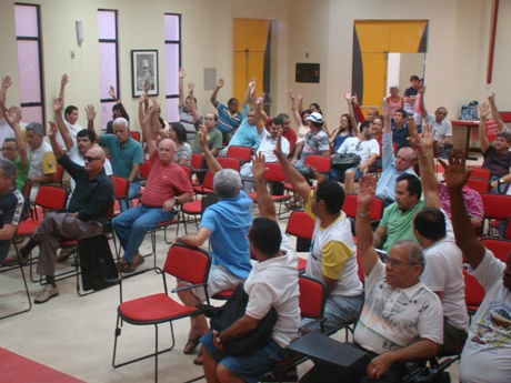 Sem votos contrários e registrando sete abstenções, os nomes indicados para compor a Comissão Organizadora do Plebiscito, foram aprovados pela maioria esmagadora da Assembleia, conforme se pode observar na foto. Fazem parte da Comissão: Claudemir Texeira (CAIXA), José Ribamar Carneiro (BB) e Bartolomeu Carvalho (BASA); além dos suplentes Roseane Moura (CAIXA), Manoel Oliveira (BASA) e Benedito Jorge (Bradesco).