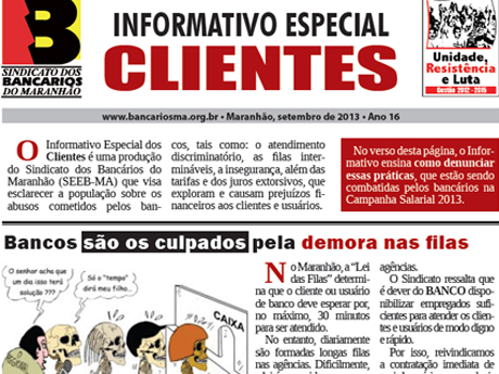 O Informativo Especial dos Clientes é uma produção do Sindicato dos Bancários do Maranhão (SEEB-MA) que visa esclarecer a população sobre os abusos cometidos pelos bancos, tais como: o atendimento discriminatório, as filas intermináveis, a insegurança, além das tarifas e dos juros extorsivos, que exploram e causam prejuízos financeiros aos clientes e usuários. O informativo ensina ainda como denunciar essas práticas, que estão sendo combatidas pelos bancários na Campanha Salarial 2013!