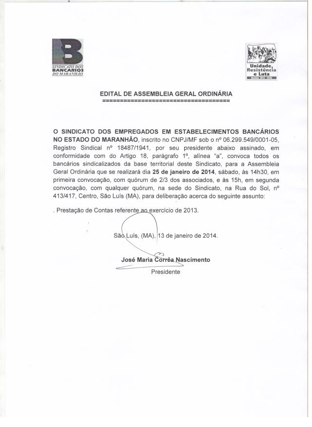 O SINDICATO DOS EMPREGADOS EM ESTABELECIMENTOS BANCÁRIOS NO ESTADO DO MARANHÃO, inscrito no CNPJ/MF sob o nº 06.299.549/0001-05, Registro Sindical nº 18487/1941, por seu presidente abaixo assinado, em conformidade com do artigo 18, parágrafo 1°, alínea "a", convoca todos os bancários sindicalizados da base territorial deste Sindicato, para a Assembleia Geral Ordinária que se realizará dia 25 de janeiro de 2014, sábado, às 14h30, em primeira convocação, com quórum de 2/3 dos associados, e às 15h00, em segunda convocação com qualquer quórum, na sede do Sindicato, na Rua do Sol, nº 413/417, Centro, São Luís (MA), para deliberação acerca do seguinte assunto: