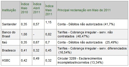 Frente a maio de 2010, o número de reclamações contra bancos também subiu. Ainda considerando aqueles com mais de um milhão de clientes, as queixas contra as instituições bancárias aumentaram 23%, já que naquele mês o total de reclamações somou 749 queixas.