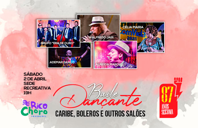 O SEEB-MA promoverá o Baile Dançante “Caribe, Bolero e Outros Salões”, no sábado (02/04), a partir das 19h, na Sede Recreativa da categoria, na Av. General Arthur Carvalho, nº 3000, no Turu, em comemoração aos 87 anos de lutas e conquistas do Sindicato.
