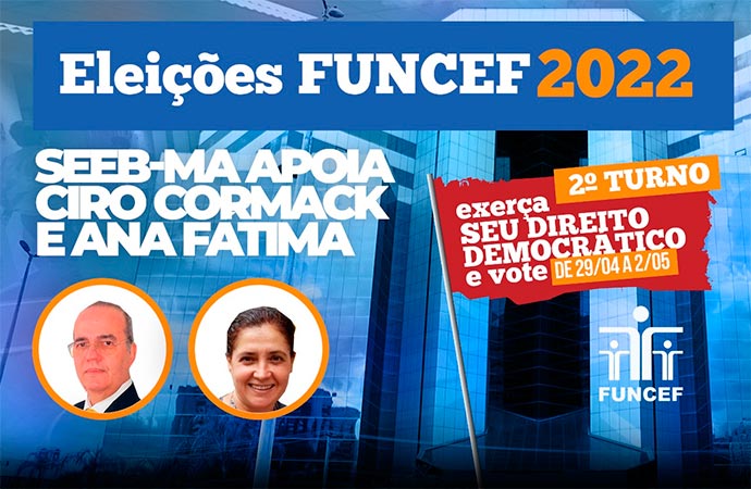 O segundo turno das Eleições FUNCEF 2022 começará nesta sexta-feira (29/04) e vai até a próxima segunda (02/05). Dois candidatos apoiados pelo SEEB-MA continuam firmes na disputa e merecem o seu voto de confiança.